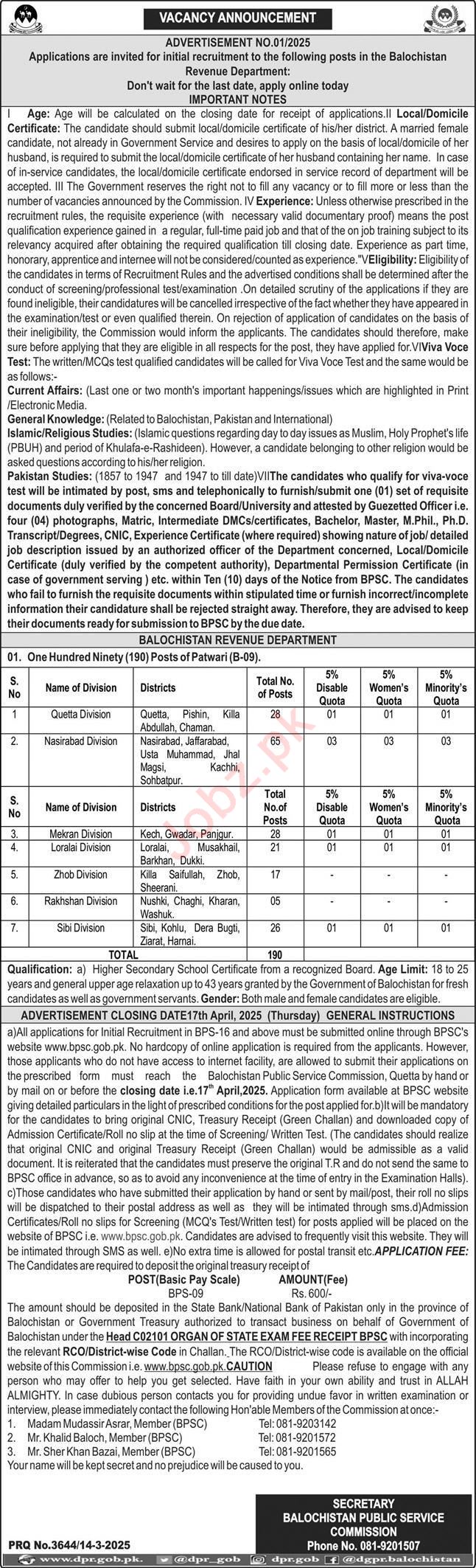 BPSC Balochistan Public Service Commission jobs advertisement dated about 16 March 2025 in daily Express Newspaper invites application for the vacant post of patwari in Quetta, quetta Balochistan Pakistan. Preferred Education is Intermediate etc.