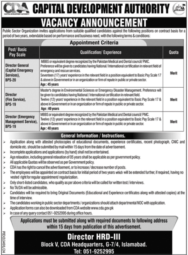 Capital Development Authority CDA Islamabad, islamabad Islamabad Pakistan invites applications from eligible candidates for the post of director fire service, director emergency management service and director general capital emergency services as per advertisement of November 23, 2024 published in daily Ausaf Newspaper. Master and MBBS etc. educational qualification will be preferred.