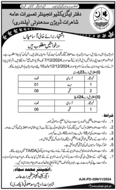 Vacant posts including mate and coolie are announced in Communication & Works Department Plandri, plandri AJK Pakistan as per 23 November 2024 advertisement in daily Ausaf Newspaper. Middle and Primary etc. educational qualification will be preferred.
