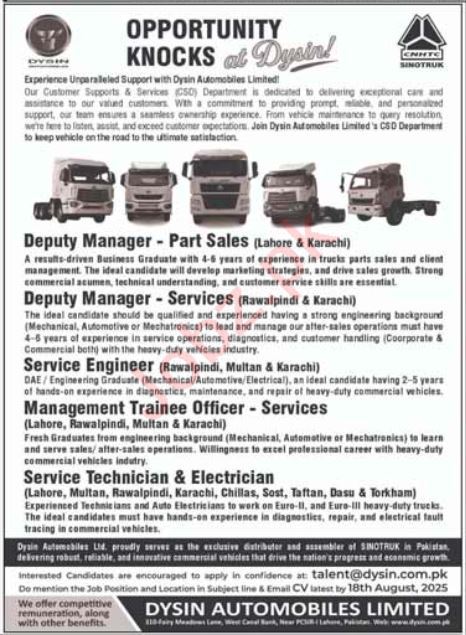 Vacant posts including service technician, deputy manager part sales, service engineer, management trainee officer, electrician and deputy manager services are announced in Dysin Automobiles Limited Lahore, lahore Punjab Pakistan as per 3 August 2025 advertisement in daily Jang Newspaper. Educational qualifications required Master and Bachelor etc.