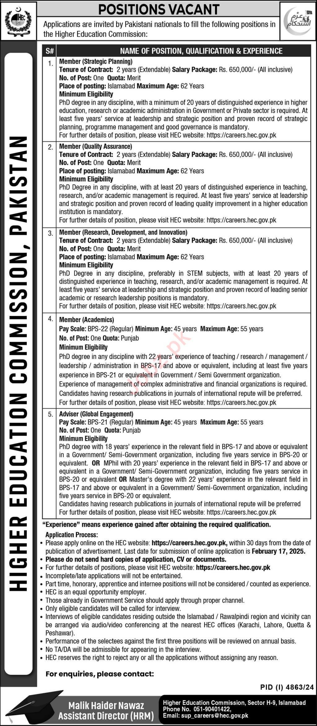 Higher Education Commission HEC Islamabad, islamabad Islamabad Pakistan invites applications from eligible candidates for the post of member quality assurance, member research development innovation, member academics, adviser global engagement and member strategic planning as per advertisement of January 19, 2025 published in daily Express Newspaper. Phd etc. educational qualification will be preferred.