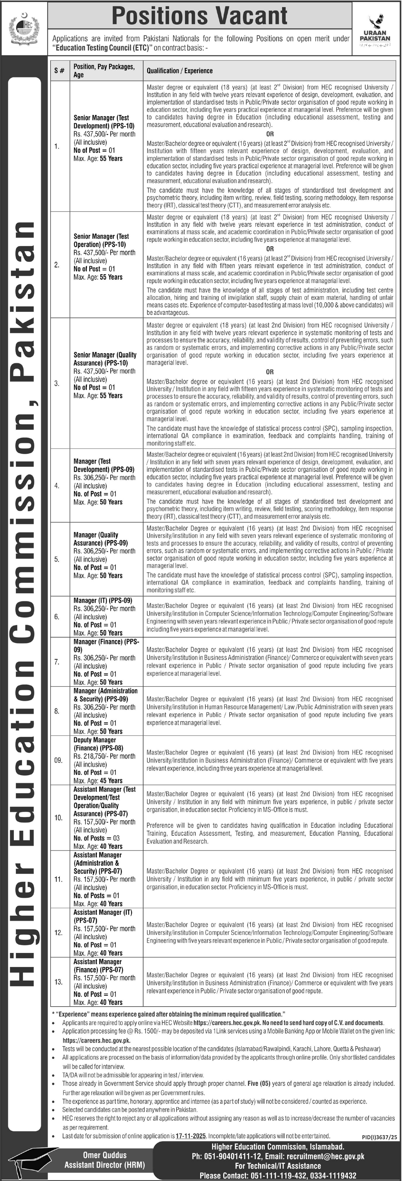 Higher Education Commission HEC jobs advertisement dated about 3 November 2025 in daily Express Tribune Newspaper invites application for the vacant post of Manager Quality Assurance, Manager It, Manager Administration, Assistant Manager It, Assistant Manager Test Development, Assistant Manager Finance, Assistant Manager Administration Security, Manager Test Operation, Manager Finance, Deputy Manager Finance and Manager Test Development in Islamabad, islamabad Islamabad Pakistan. Master and Bachelor etc. educational qualification will be preferred.