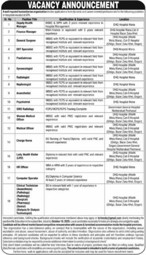 Humanitarian Organization Wana, wana Khyber Pakhtunkhwa KPK Pakistan invites applications from eligible candidates for the post of computer operator, radiologist, clinical technician, charge nurse, ect specialist, general surgeon, deputy health manager, finance manager, gynecologist, anaesthetist, women medical officer, psychiatrist, nephrologist, medical officer, hr officer, lady health visitor and pediatrician as per advertisement of September 28, 2025 published in daily Mashriq Newspaper. MBA and MBBS etc. educational qualification will be preferred.