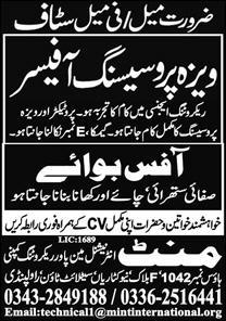 Mint International Manpower Recruiting Satellite Town Rawalpindi, rawalpindi Punjab Pakistan invites applications from eligible candidates for the post of visa processing officer and office boy as per advertisement of May 11, 2025 published in daily Express Newspaper. Preferred Education is Bachelor and Middle etc.