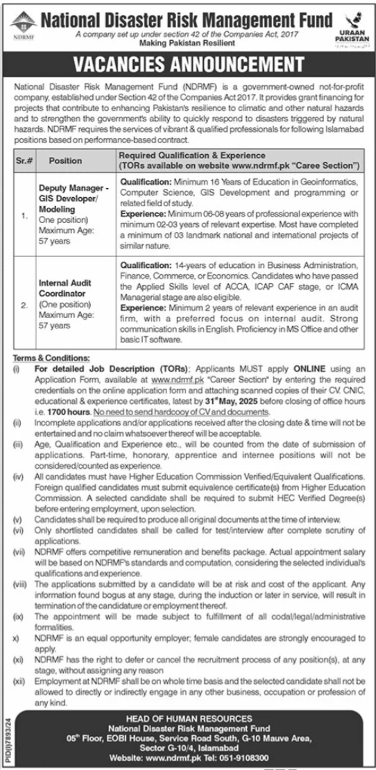 National Disaster Risk Management Fund NDRMF invites applications for job positions advertised in daily The News dated 17 May 2025 for following vacancies in G-10/4 Islamabad, islamabad Islamabad Pakistan.