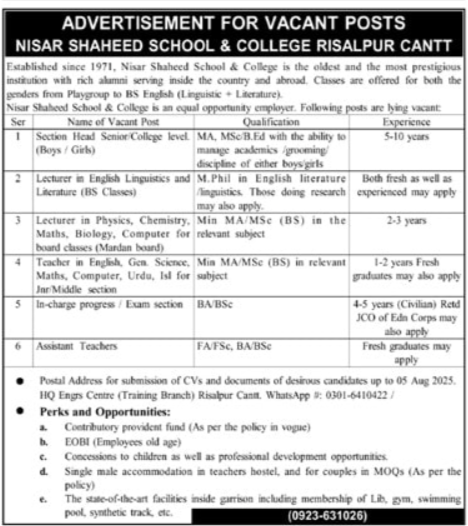 Nisar Shaheed School & College invites applications for job positions advertised in daily Mashriq dated 27 July 2025 for following vacancies in Risalpur, risalpur Khyber Pakhtunkhwa KPK Pakistan.