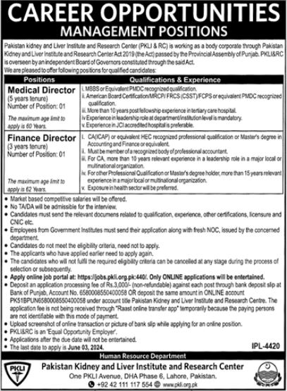 Latest Government jobs in Pakistan Kidney And Liver Institute And Research Centre PKLI in Management and others can be applied till 3 June 2024 or as per closing date in newspaper ad. Read complete ad online to know how to apply on latest Pakistan Kidney And Liver Institute And Research Centre PKLI job opportunities.