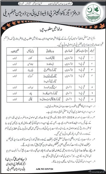 Highways Division is looking for candidates for following posts as per job advertisement published in daily Mahasib Newspaper of July 12, 2024 for location Jhelum Valley, jhelum valley AJK Pakistan: