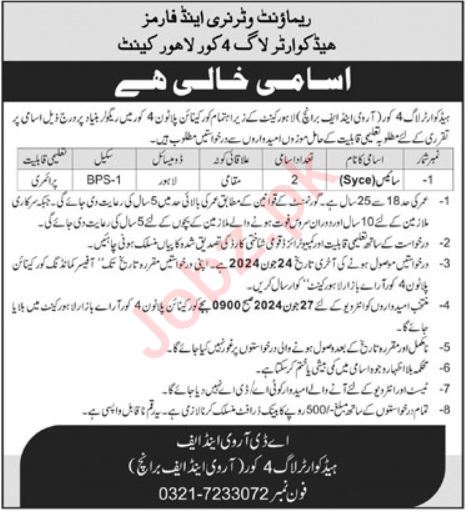 Remount Veterinary and Farms jobs advertisement dated about 16 June 2024 in daily Ausaf Newspaper invites application for the vacant post of syce in Lahore, lahore Punjab Pakistan. Preferred Education is Primary etc.