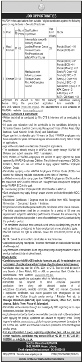 Water and Power Development Authority WAPDA Lahore, lahore Punjab Pakistan invites applications from eligible candidates for the post of head fireman and fireman as per advertisement of September 13, 2024 published in daily K2 Newspaper. Preferred Education is Intermediate and Matric etc.