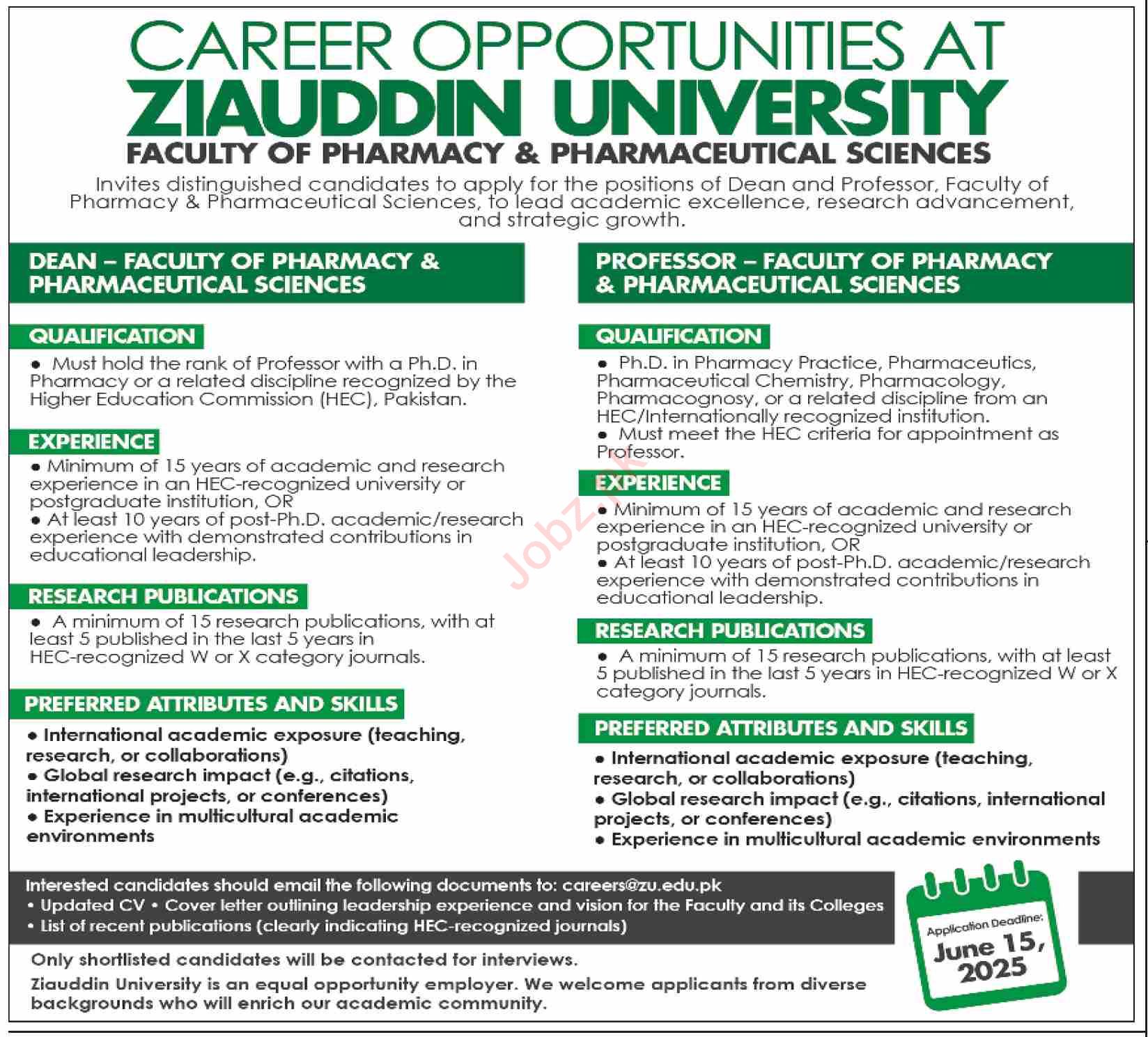 Ziauddin University jobs advertisement dated about 1 June 2025 in daily Dawn Newspaper invites application for the vacant post of professor and dean in Karachi, karachi Sindh Pakistan. Preferred Education is Phd etc.