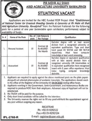 Pir Mehr Ali Shah Arid Agriculture University UAAR invites applications for job positions advertised in daily Nation dated 16 March 2022 for following vacancies in Rawalpindi, rawalpindi Punjab Pakistan.