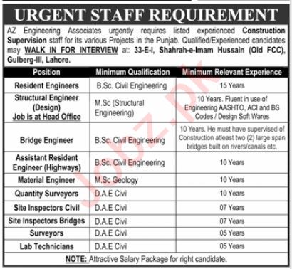 AZ Engineering Associates jobs advertisement dated about 20 January 2025 in daily Jang Newspaper invites application for the vacant post of assistant resident engineer, structural engineer, resident engineer, site inspector civil, material engineer, lab technician, site inspector bridge, bridge engineer, surveyor and quantity surveyor in Lahore, lahore Punjab Pakistan. Persons with B.E, DAE and M.sc etc. education can apply.