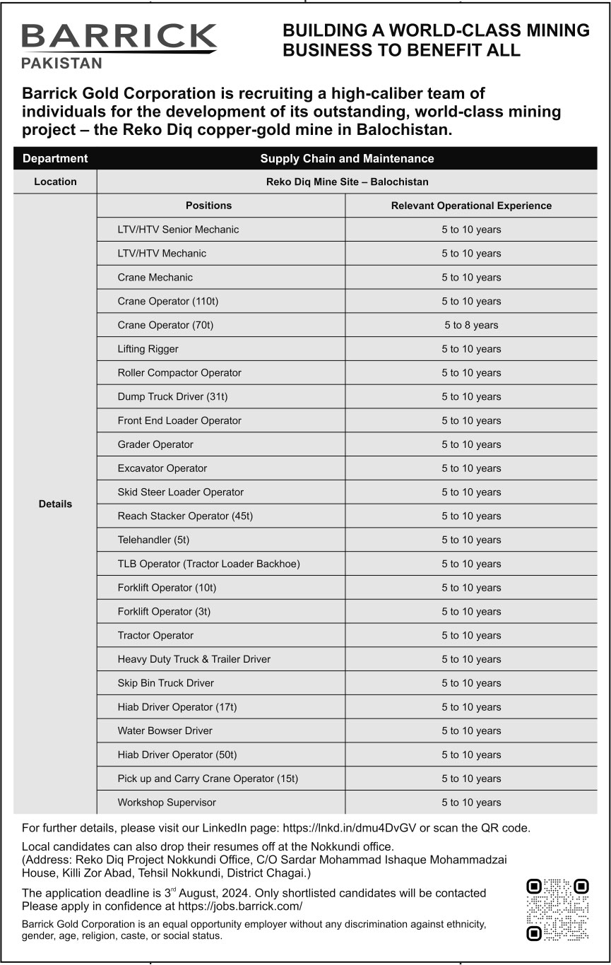 Barrick Pakistan invites applications for job positions advertised in daily Other dated 13 July 2024 for following vacancies in Chaghi, chaghi Balochistan Pakistan.
