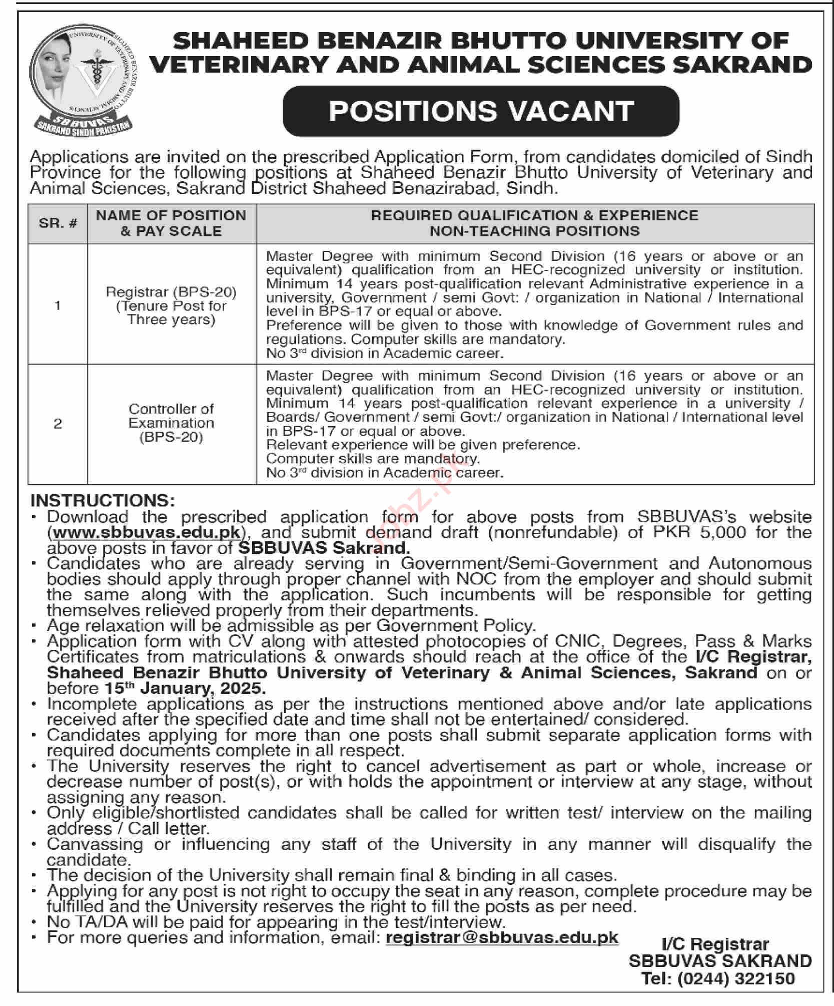 Shaheed Benazir Bhutto University of Veterinary and Animal Sciences jobs advertisement dated about 22 December 2024 in daily Dawn Newspaper invites application for the vacant post of registrar and controller of examinations in Sakrand, sakrand Sindh Pakistan. Candidates with Master etc. educational background will be preferred.