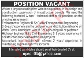 Vacant posts including environmental engineer, accountant and highway engineer are announced in Private Consulting Firm Lahore, lahore Punjab Pakistan as per 12 November 2023 advertisement in daily Jang Newspaper. Educational qualifications required M.sc, B.E and Intermediate etc.