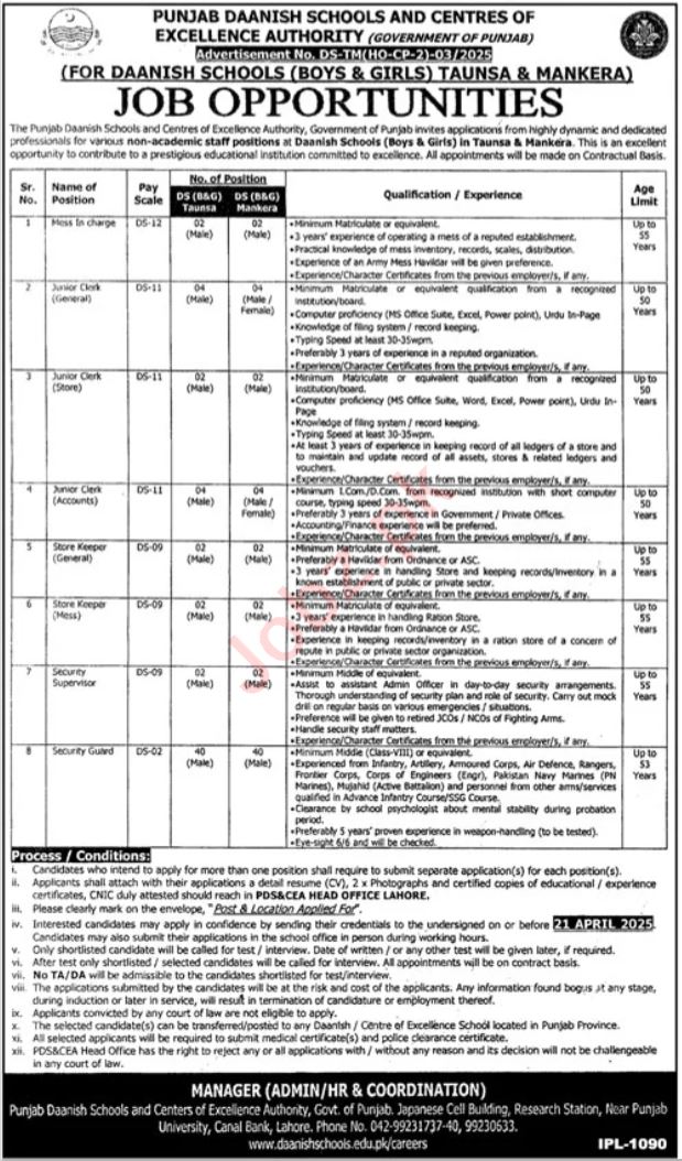 Punjab Daanish Schools & Center Of Excellence Authority jobs advertisement dated about 23 March 2025 in daily Jang Newspaper invites application for the vacant post of security guard, house in charge, store keeper general, security supervisor, clerk accounts, clerk general, clerk store and store keeper mess in Taunsa Sharif, bhakkar and taunsa sharif Punjab Pakistan. Persons with Matric, Middle and Intermediate etc. education can apply.