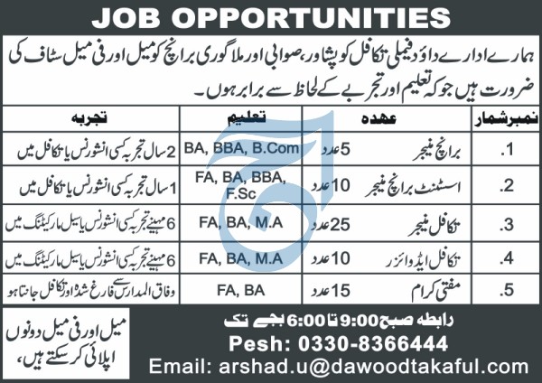Dawood Family Takaful Ltd invites applications for job positions advertised in daily Aaj dated 15 August 2023 for following vacancies in Peshawar, peshawar Khyber Pakhtunkhwa KPK Pakistan.