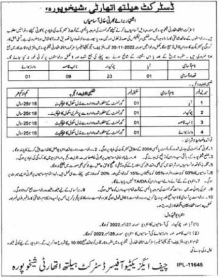 Vacant posts including naib qasid, aya, ward boy and chowkidar are announced in District Health Authority Sheikhupura, sheikhupura Punjab Pakistan as per 16 November 2022 advertisement in daily Daily Pakistan Newspaper. Preferred Education is Primary and Middle etc.