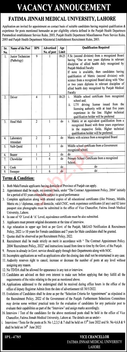 Vacant posts including technician pathalogy, head mali, sweeper, bearer, cook, driver, chowkidar, laboratory attendant and naib qasid are announced in Fatima Jinnah Medical University FJMU Lahore, lahore Punjab Pakistan as per 11 May 2022 advertisement in daily Nawaiwaqt Newspaper. Preferred Education is Matric, Others, Primary, Intermediate and Middle etc.