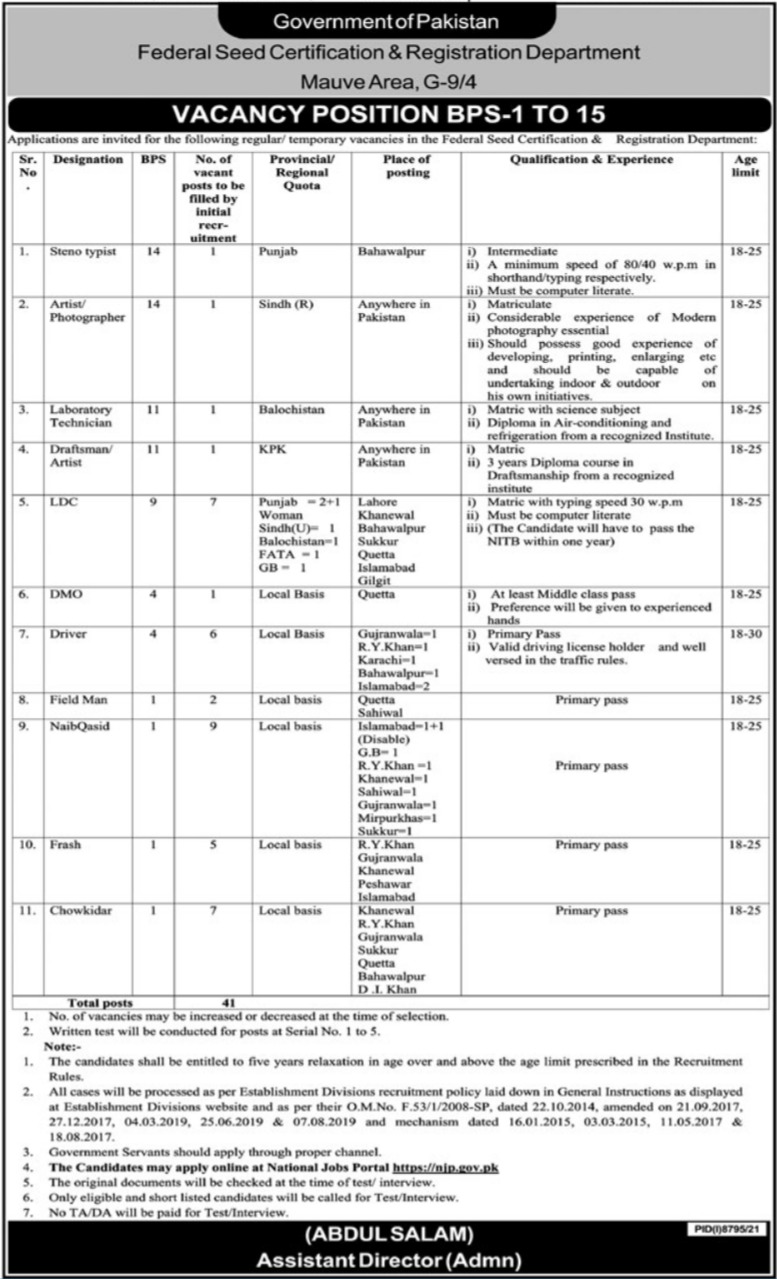 Federal Seed Certification & Registration Department FSC&RD Islamabad, islamabad, lahore, karachi, khanewal, bahawalpur, quetta, mirpur khas, dera ismail khan, rahim yar khan, gujranwala, sahiwal, gilgit, peshawar and sukkur Islamabad Pakistan invites applications from eligible candidates for the post of dmo, field man, laboratory technician, frash, draftsman, steno typist, ldc, chowkidar, driver, artist, naib qasid and photographer as per advertisement of June 15, 2022 published in daily Ausaf Newspaper. Others, Middle, Matric, Intermediate and Primary etc. educational qualification will be preferred.