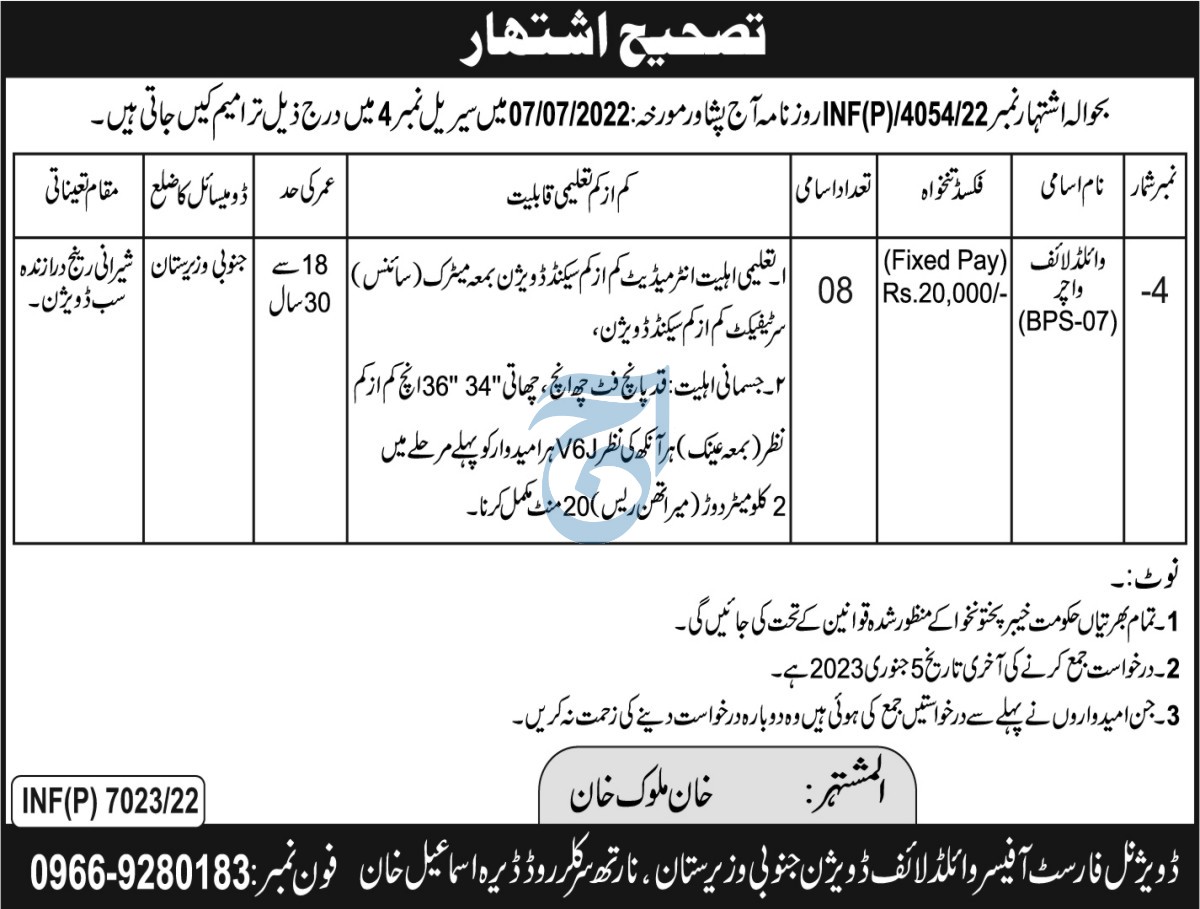 Forest & Wildlife Department jobs advertisement dated about 16 December 2022 in daily Aaj Newspaper invites application for the vacant post of wildlife watcher in Dera Ismail Khan, dera ismail khan Khyber Pakhtunkhwa KPK Pakistan. Preferred Education is Intermediate and Matric etc.