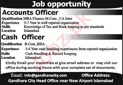 Gandhara City Pvt Ltd Islamabad, islamabad Islamabad Pakistan invites applications from eligible candidates for the post of cash officer and accounts officer as per advertisement of September 22, 2024 published in daily Express Newspaper. Preferred Education is MBA, CA, M.com, BBA and B.com etc.