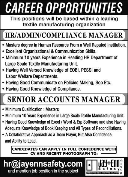JayEnn Safety Group invites applications for job positions advertised in daily Express dated 26 July 2024 for following vacancies in Faisalabad, faisalabad Punjab Pakistan.