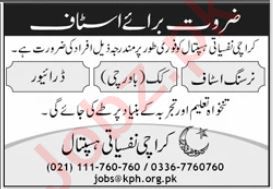 Karachi Psychiatric Hospital KPH Karachi, karachi Sindh Pakistan invites applications from eligible candidates for the post of cook, bawarchi, driver and nursing staff as per advertisement of October 20, 2024 published in daily Jang Newspaper. Persons with Intermediate, Primary, Bachelor and Middle etc. education can apply.