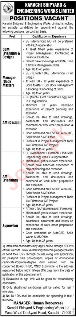 Vacant posts including manager dock master, am design, dgm planning design, supervisor and am planning are announced in Karachi Shipyard and Engineering Works Limited Karachi, karachi Sindh Pakistan as per 21 January 2024 advertisement in daily The News Newspaper. Candidates with B.E, Bachelor, MS and DAE etc. educational background will be preferred.