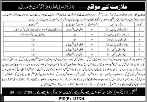 Military Lands and Cantonment Department jobs advertisement dated about 15 May 2024 in daily Mashriq Newspaper invites application for the vacant post of chowkidar, mali, driver and naib qasid in Peshawar, peshawar Khyber Pakhtunkhwa KPK Pakistan. Educational qualifications required Primary and Middle etc.