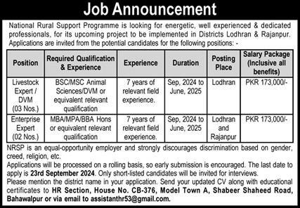 National Rural Support Programme NRSP is looking for candidates for following posts as per job advertisement published in daily Express Newspaper of September 20, 2024 for location Lodhran, rajanpur and lodhran Punjab Pakistan: