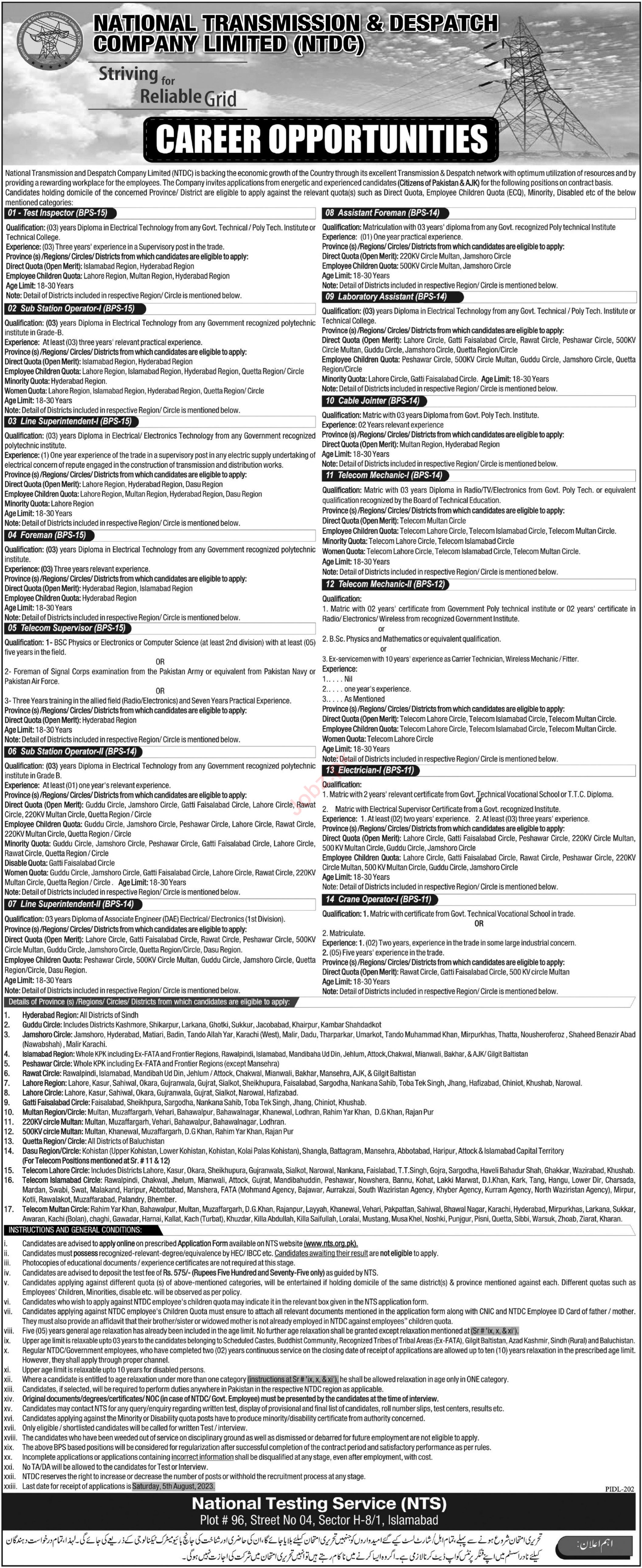National Transmission & Despatch Company NTDC jobs advertisement dated about 16 July 2023 in daily Express Tribune Newspaper invites application for the vacant post of Sub Station Operator Ii, Telecom Mechanic, Electrician, Telecom Mechanic Ii, Crane Operator, Sub Station Operator, Test Inspector, Line Superintendent Ii, Laboratory Assistant, Telecom Supervisor, Cable Jointer, Line Superintendent, Foreman and Assistant Foreman in Islamabad, multan, peshawar, kohistan, islamabad, lahore, hyderabad, guddu, jamshoro, quetta and faisalabad Islamabad Pakistan. Preferred Education is BCS, Others, DAE and Matric etc.