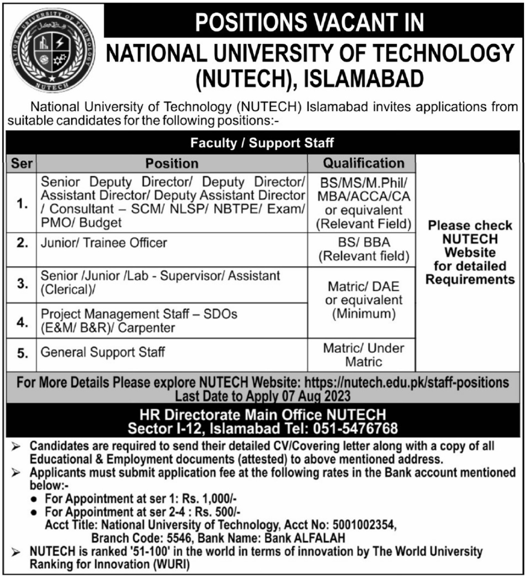 Vacancies in National University of Technology NUTECH Advertisement July 2023