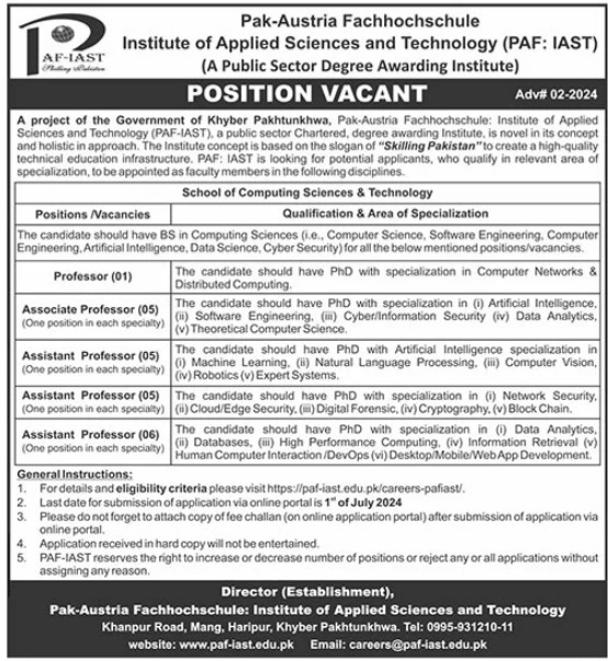 Vacancies in Pak Austria Fachhochschule Institute of Applied Sciences & Technology Advertisement June 2024