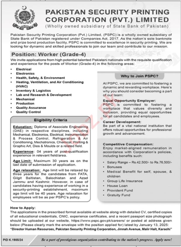 Vacancies in Pakistan Security Printing Corporation Pvt Ltd Advertisement December 2024