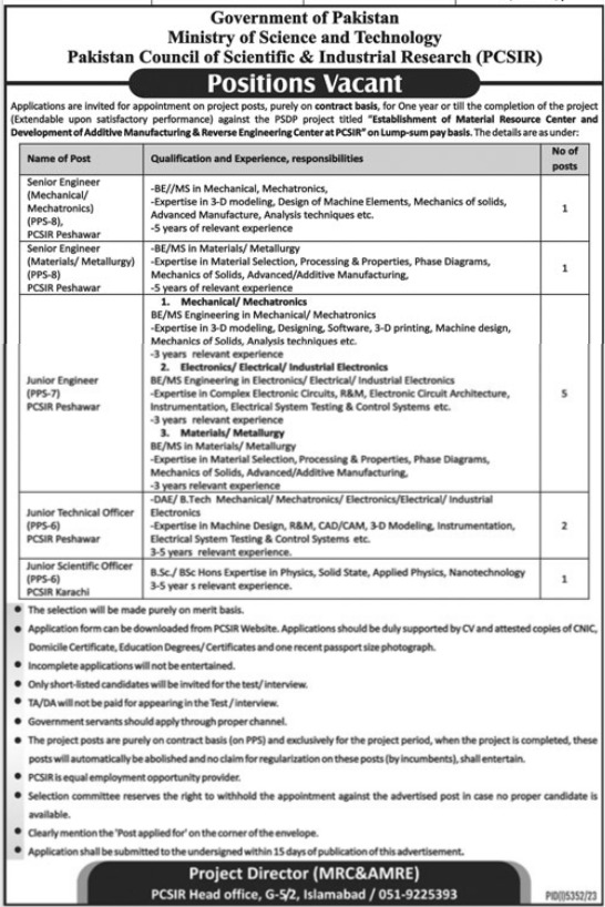 Vacant posts including engineer, engineer mechatronics, engineer mechanical, engineer materials, technical officer, engineer metallurgy and scientific officer are announced in Pakistan Council of Scientific and Industrial Research PCSIR Peshawar, karachi and peshawar Khyber Pakhtunkhwa KPK Pakistan as per 9 March 2024 advertisement in daily Jang Newspaper. Preferred Education is MS, DAE and B.E etc.