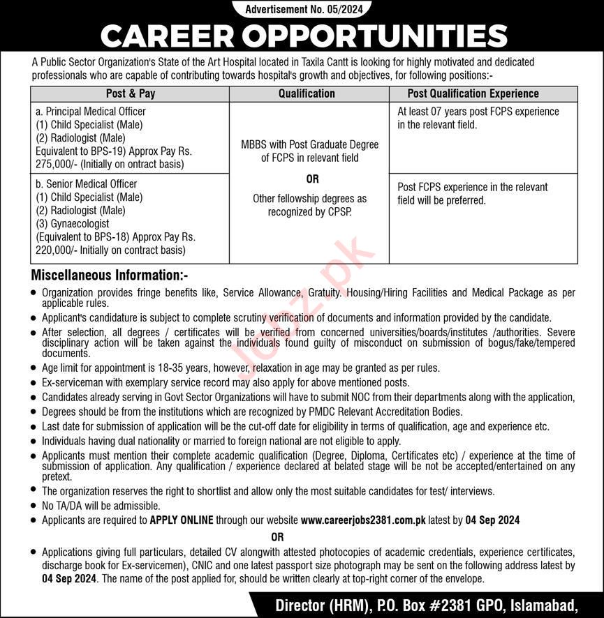 Public Sector Hospital invites applications for job positions advertised in daily Express dated 18 August 2024 for following vacancies in Islamabad, islamabad Islamabad Pakistan.