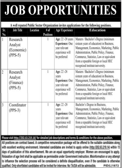 Public Sector Organization Islamabad, islamabad Islamabad Pakistan invites applications from eligible candidates for the post of research analyst finance, research analyst economic and coordinator as per advertisement of December 16, 2023 published in daily Jang Newspaper. Preferred Education is Master and Bachelor etc.
