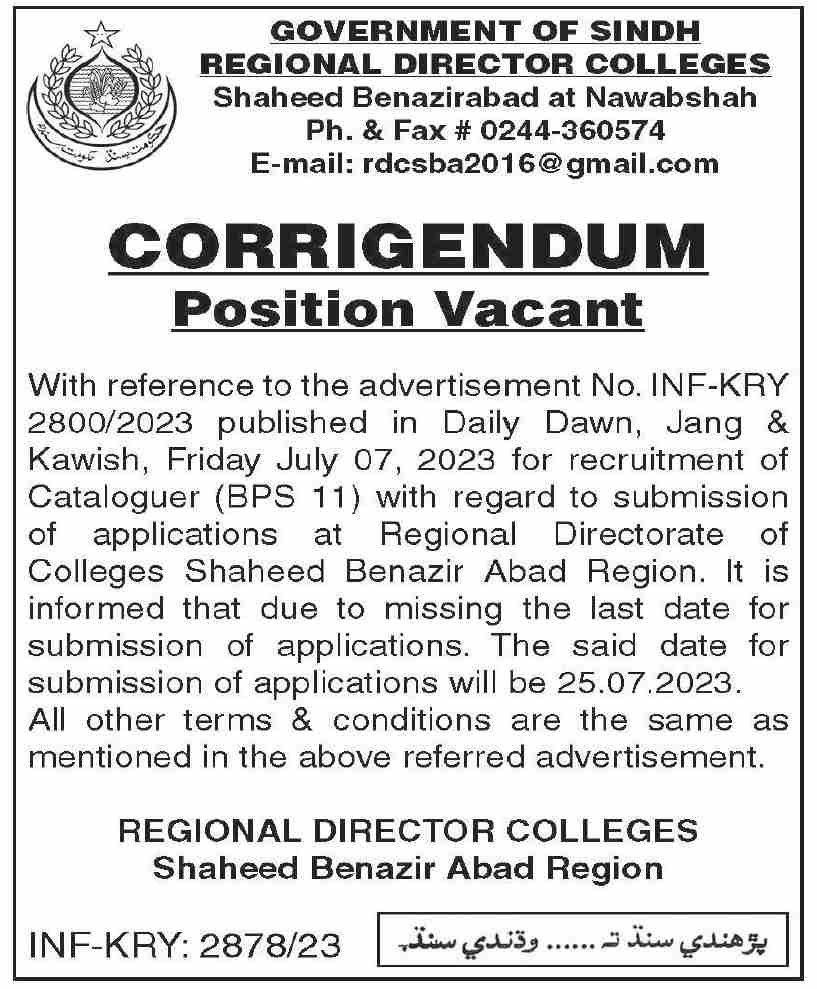 Regional Directorate of College jobs advertisement dated about 11 July 2023 in daily Dawn Newspaper invites application for the vacant post of cataloguer in Nawabshah, nawabshah Sindh Pakistan. Educational qualifications required Bachelor etc.