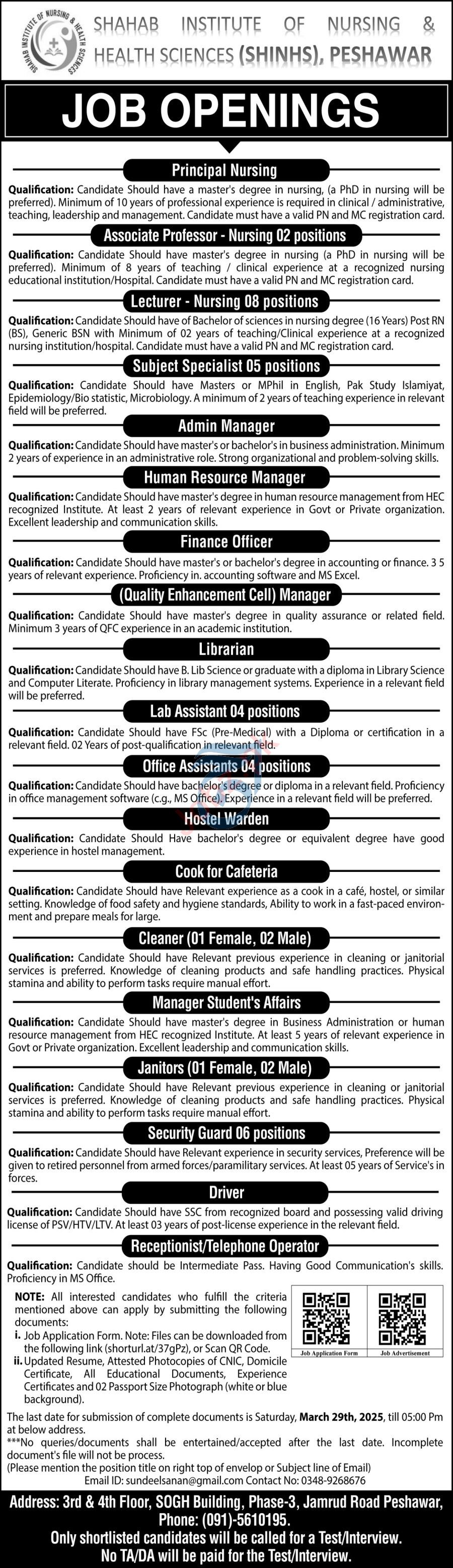 Vacant posts including hostel warden, human resource manager, janitor, admin manager, telephone operator, quality enhancement cell manager, security guard, cleaner, office assistant, associate professor nursing, subject specialist, librarian, driver, receptionist, cook, manager student affairs, finance officer, lecturer nursing, principal nursing and lab assistant are announced in Shahab Institute of Nursing & Health Sciences Jamrud Road Peshawar, peshawar Khyber Pakhtunkhwa KPK Pakistan as per 16 March 2025 advertisement in daily Aaj Newspaper. Master, Primary, Bachelor and Matric etc. educational qualification will be preferred.