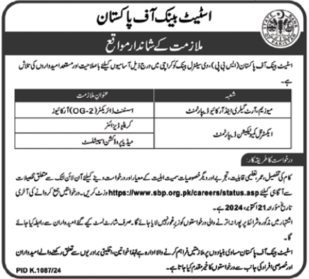Vacant posts including creative designer, assistant director archives and media production specialist are announced in State Bank of Pakistan SBP Karachi, karachi Sindh Pakistan as per 6 October 2024 advertisement in daily Nawaiwaqt Newspaper. Persons with Master and Bachelor etc. education can apply.