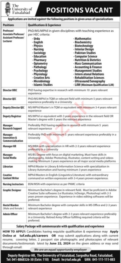 The University of Faisalabad Faisalabad, faisalabad Punjab Pakistan invites applications from eligible candidates for the post of associate professor, lecturer, deputy registrar, hostel warden, creative content writer, manager research support, admin officer, manager hr, graphic designer, director oric, manager social media, manager innovation commercialization, librarian, nursing instructor, deputy director qec, assistant professor, director qec and professor as per advertisement of June 9, 2024 published in daily Jang Newspaper. Preferred Education is MS, Bachelor, Phd, MBA and Mphil etc.