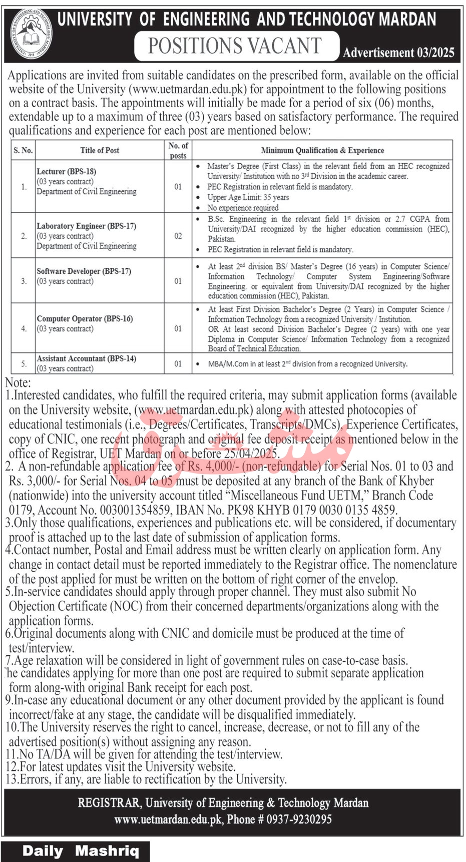 University of Engineering and Technology UET invites applications for job positions advertised in daily Mashriq dated 29 March 2025 for following vacancies in Mardan, mardan Khyber Pakhtunkhwa KPK Pakistan.