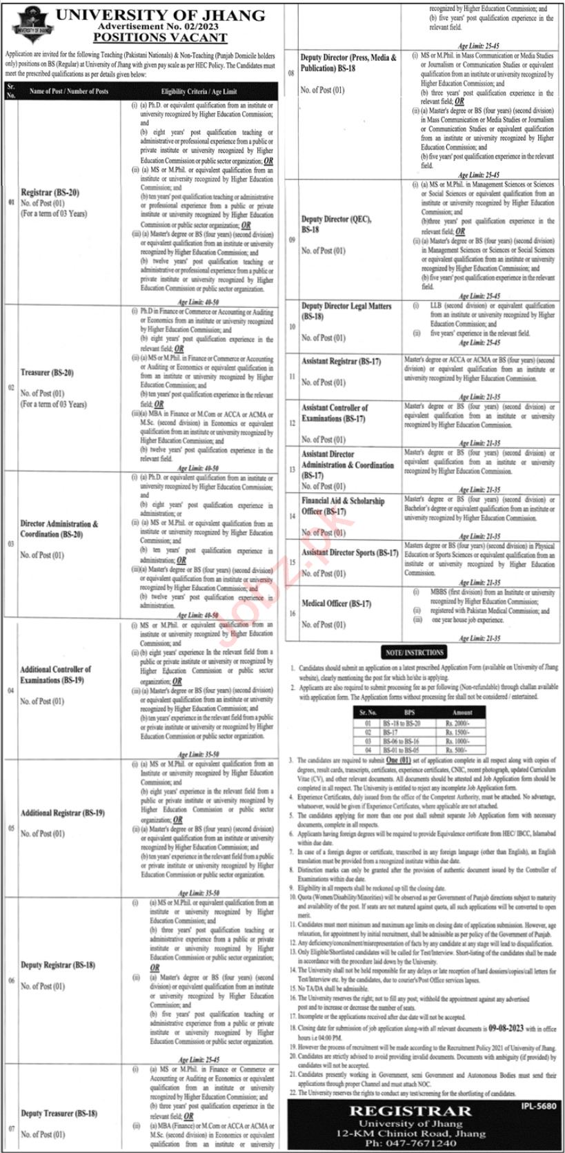 University of Jhang jobs advertisement dated about 23 July 2023 in daily Jang Newspaper invites application for the vacant post of deputy director press media publication, treasurer, deputy director qec, deputy treasurer, director administration coordination, deputy director legal matters, additional registrar, financial aid scholarship officer, registrar, assistant director administration coordination, deputy registrar, assistant registrar, assistant controller of examination, additional controller of examination, medical officer and assistant director sports in Jhang, jhang Punjab Pakistan. MS, ACCA, Phd, MBA, LLb, Mphil, Master and MBBS etc. educational qualification will be preferred.