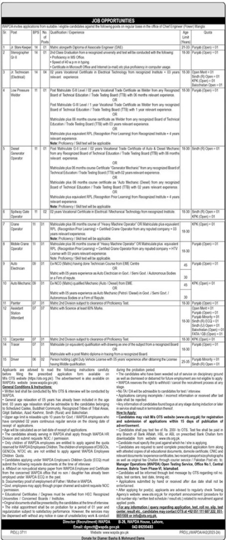Water and Power Development Authority WAPDA jobs advertisement dated about 24 May 2024 in daily The News Newspaper invites application for the vacant post of spillway gate operator, crane operator, stenographer, assistant station attendant, painter, tracer, diesel generator operator, low pressure welder, carpenter, auto mechanic, mobile crane operator, auto electrician, driver and store keeper in Lahore, lahore Punjab Pakistan. Persons with Others, Bachelor, Primary, Intermediate and Matric etc. education can apply.