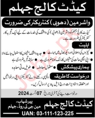 Cadet College Jhelum jobs advertisement dated about 28 July 2024 in daily Jang Newspaper invites application for the vacant post of washer man and dhobi in Jhelum, jhelum Punjab Pakistan. Persons with Intermediate and Matric etc. education can apply.
