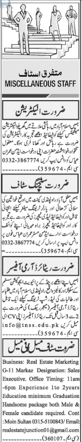 Vacant posts including female staff, retired army officer, male staff, electrician and stitching staff are announced in Private Organization Islamabad, islamabad Islamabad Pakistan as per 24 September 2022 advertisement in daily Jang Newspaper. Educational qualifications required Bachelor, Matric and Intermediate etc.