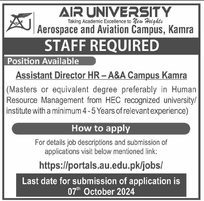 Air University jobs advertisement dated about 25 October 2024 in daily Dawn Newspaper invites application for the vacant post of assistant director hr in Attock, attock Punjab Pakistan. Master etc. educational qualification will be preferred.