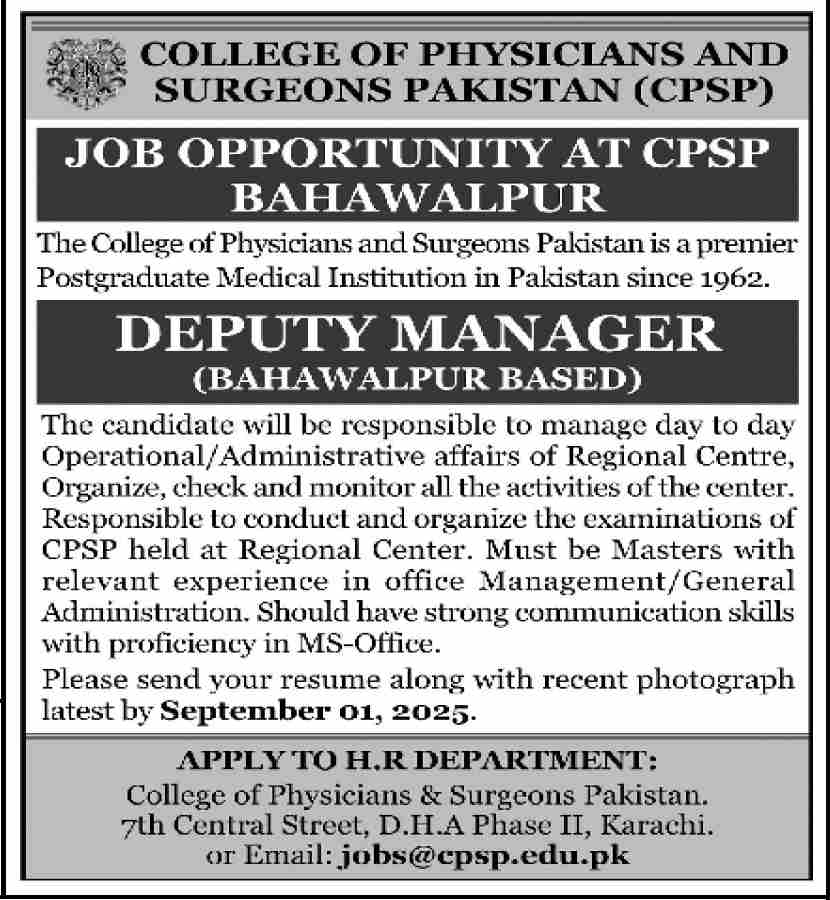 College of Physicians and Surgeons Pakistan Bahawalpur, bahawalpur Punjab Pakistan invites applications from eligible candidates for the post of deputy manager as per advertisement of August 17, 2025 published in daily Dawn Newspaper. Bachelor and Master etc. educational qualification will be preferred.